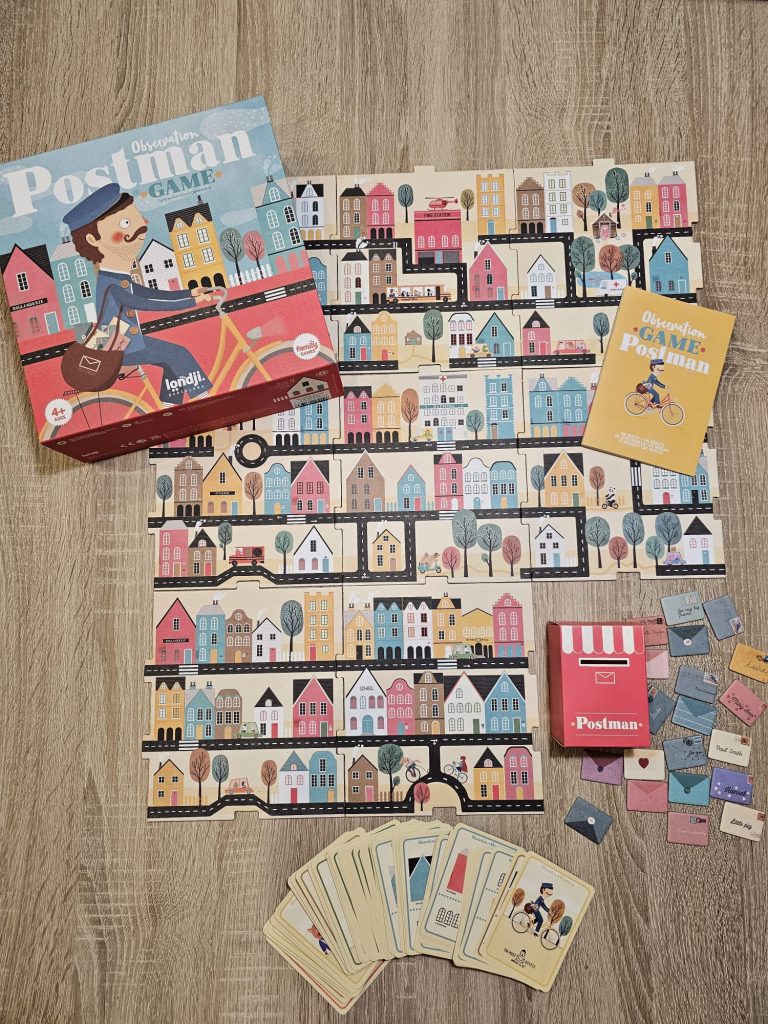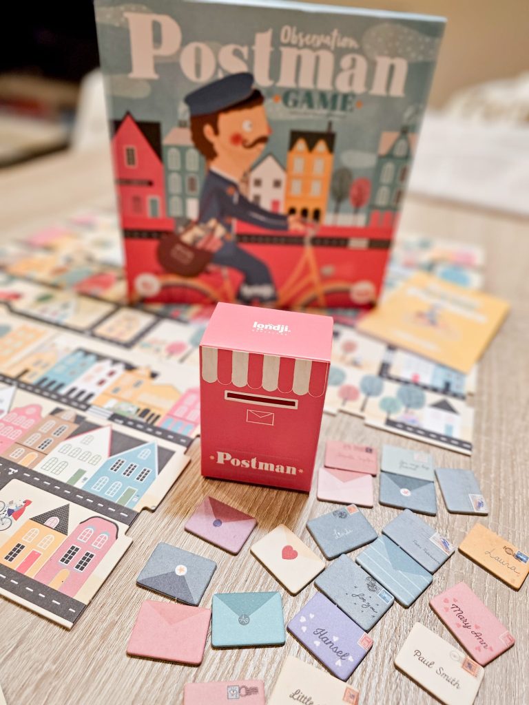 - Descripció: Postman és un joc cooperatiu i d’observació de Londji en què els jugadors/es es converteixen en carters i carteres que han de repartir totes les cartes abans que s’acabi el temps. A cada partida, es col·loquen diferents cases al tauler i s’han de seguir les rutes correctes per portar cada carta al seu destinatari. El joc combina memòria, atenció i velocitat, amb el toc encantador i artesanal característic dels jocs de Londji, fets amb materials sostenibles i il·lustracions precioses.